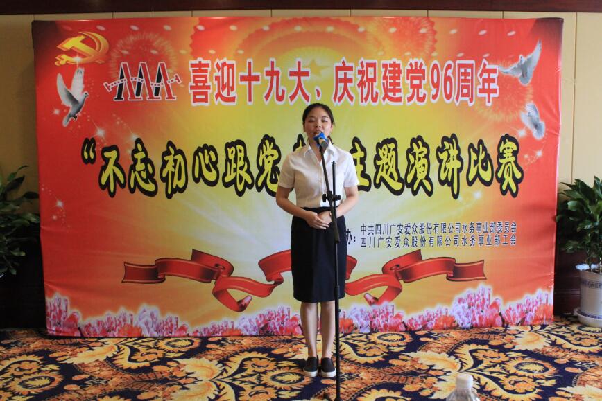 為迎接黨的十九大勝利召開,隆重慶祝建黨96周年,深入推進“兩學一做”學習教育常態(tài)化,團結(jié)、凝聚職工跟黨走,進一步激發(fā)廣大員工愛黨、愛國、愛崗、敬業(yè)、奉獻的熱情,全力推動企業(yè)轉(zhuǎn)型發(fā)展,6月16日下午,水務事業(yè)部黨委在瑪瑙城國際大酒店峨眉山廳舉辦了“喜迎十九大·建黨96周年·不忘初心跟黨走”主題演講比賽。水務事業(yè)部團支書、行政管理部經(jīng)理張粲主持本次活動。
