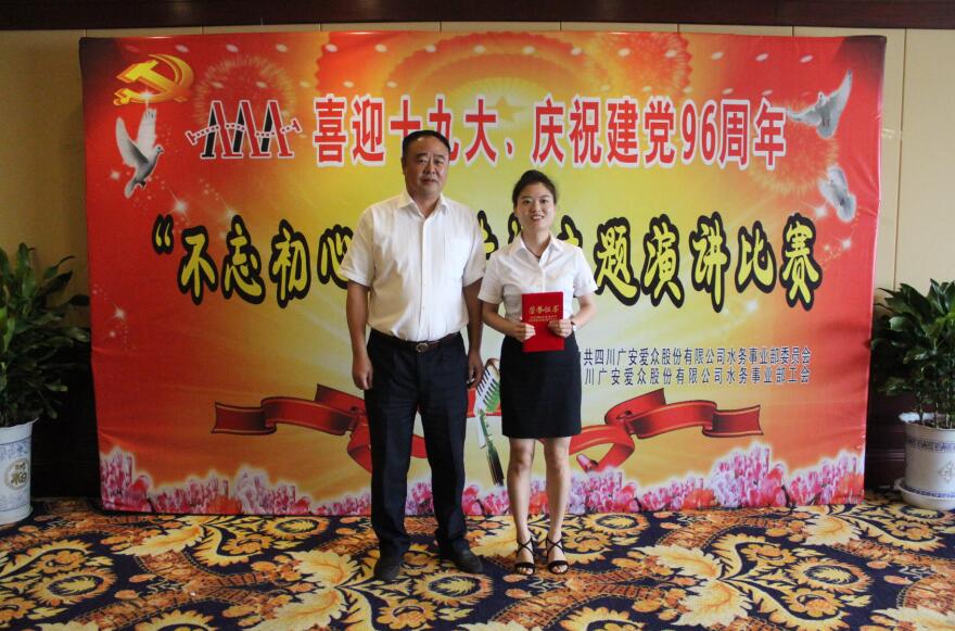 經(jīng)過激烈角逐,評委們從演講材料、語言表達、形體語言、主體形象多方面綜合考量,采取現(xiàn)場打分的方式,評出了一等獎、二等獎、三等獎和優(yōu)秀獎。來自廣安花園制水有限公司的選手陳肖依,憑借充分的準備和完美的舞臺表現(xiàn),以一篇《不忘初心跟黨走-為人民服務》摘得桂冠,成為比賽的冠軍。